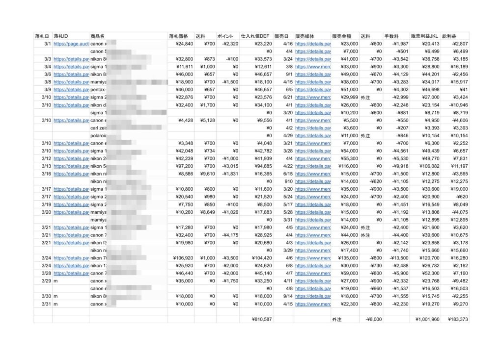 この月は27回仕入れをして、35個の販売ぺージに分けて売却しています。